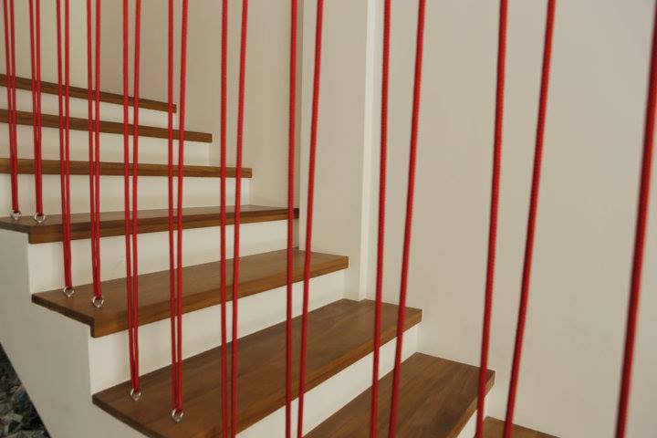 Escalera revestida en madera con barandilla decorativa en cuerda de nylon